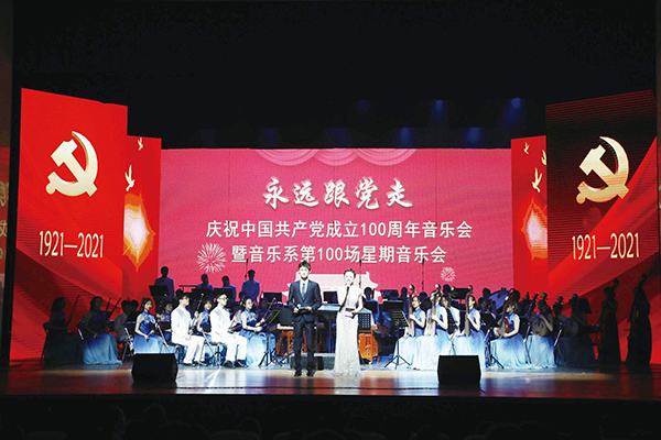 音乐系:6月10日至11日,奏响《永远跟党走》大型音乐会,音乐会以党的发展历程为主线。开篇为70人的民乐合奏,演奏曲目是根据经典作品《唱支山歌给党听》改编的民族管弦乐《再唱山歌给党听》。第一乐章《光明》、第二乐章《追寻》、第三乐章《颂歌》,呈现出女生独唱《南湖的船党的摇篮》、竹笛协奏《绣金匾》、歌剧《党的女儿》选段、大型声乐套曲《长征组歌》、钢琴协奏曲《黄河》等经典音乐作品。