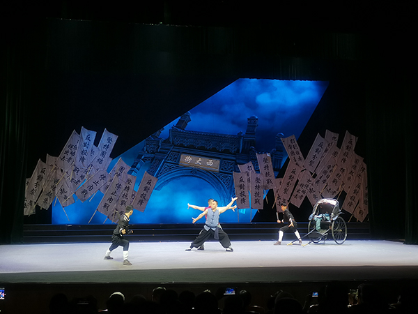 整场演出座无虚席,特别是第二场的打戏,掌声与叫好声更是不绝于耳。“在这场打戏中加入了道具黄包车,这是我从京剧《骆驼祥子》里找到的灵感,《骆驼祥子》里是拉着黄包车做一些动作,而我们是直接将打戏与黄包车结合起来,也这是一种创新, 既贴合了剧情的年代感,又增加了武戏的看点。”导演刘少华介绍,“而且我们在演出中还加入了影视的手法,借助大荧幕的形式,层层推进。切换场景,也由传统的锣鼓音乐过度,改为一种无缝衔接的感觉,特别简短自然。”