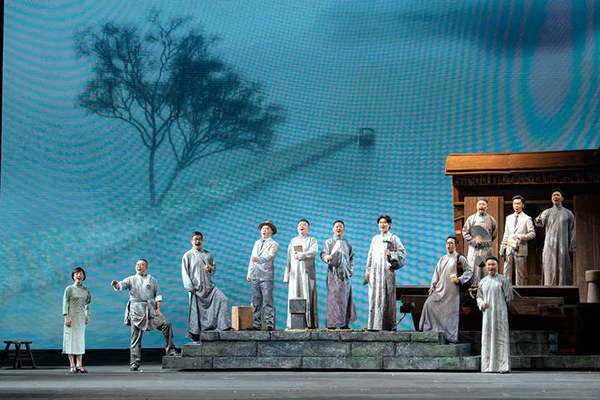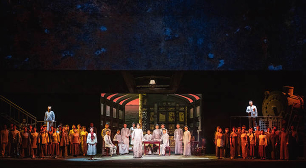 在舞台表现上,歌剧《红船》打破传统叙事构架,以非线性的、碎片式的多维度多场景多段落方式结构戏剧,推拉幕、转台和灯光投影技术的巧妙运用,辅以电影蒙太奇手法,使得近50个场景有机串联。上下起落左右推移间,各个场景在行云流水的转换中立体化、焦点化,彰显磅礴大气、辽阔厚重的史诗气韵。音乐设计以行进式作为主要节奏,张力十足,既有恢宏气势、凝重沉郁,又有细腻柔婉、地域风情。其中,独唱、合唱、重唱各有章法,大调、小调、离调交替更迭,宣叙、咏叙、咏叹运用自如,人物主题音乐鲜明,层次变化异常丰富,完美实现戏剧性、情感性和诗意化的表达。