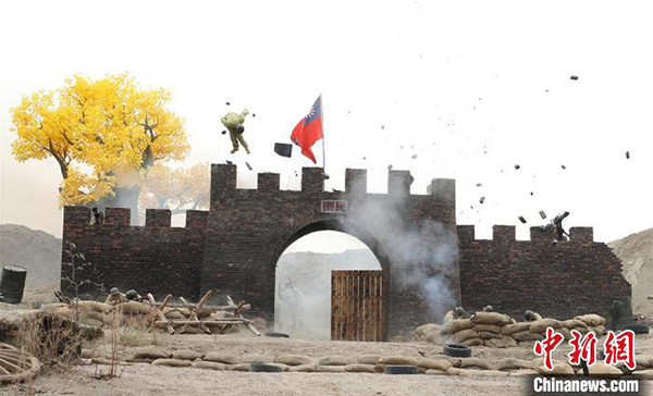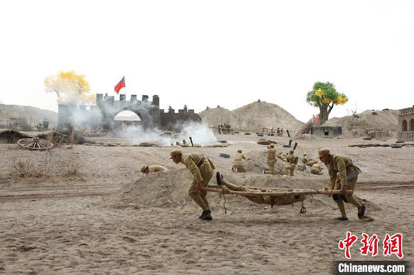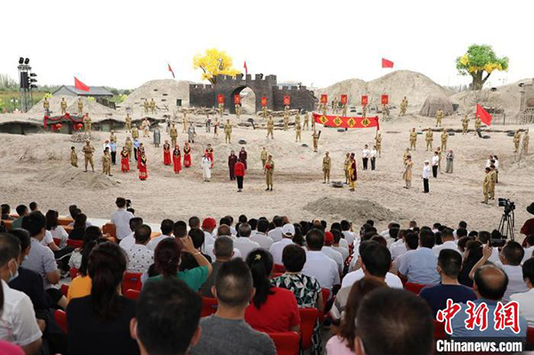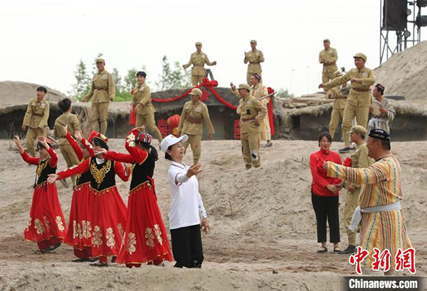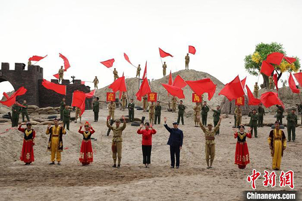 中新网新疆阿拉尔7月6日电 (李桃 马良栋 林国强)7月6日上午11点,大型红色文化实景剧《三五九旅是模范》在新疆生产建设兵团第一师阿拉尔市首演,独特的演出方式,吸引了阿拉尔市及周边团场近千名职工群众现场观看。