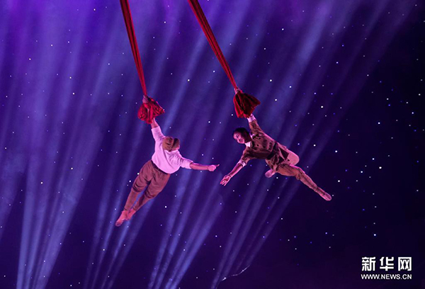 7月2日,演员在广西文化艺术中心大剧院表演杂技剧《英雄虎胆》。新华社记者 杨驰 摄