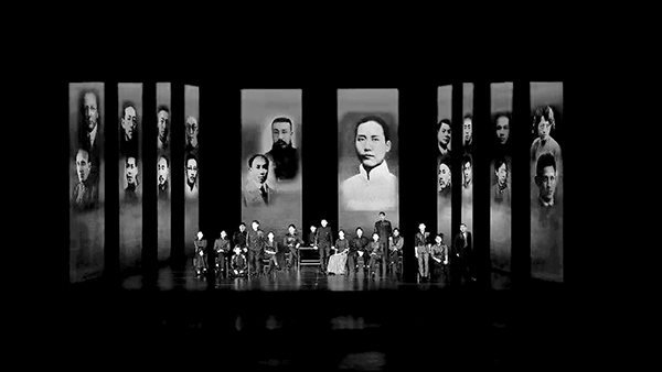 演员一人分饰多角,在跳进跳出间扮演或者呈现具体的场景,也是该剧的一大特色。青春洋溢的演员们身穿极具中式设计感的服装,展现着历史人物青春而饱含理想的风貌。演员们利用椅子不同的摆放位置,或参差或整齐地站立和坐着,群像式地向观众讲述和重现这一段恢弘的红色历史故事,他们在历史讲述者与历史人物的角色间不时切换,引领观众了解中国共产党初创时期的历史,宛如党史博物馆的解说员,为观众呈现一台生动的党史课。