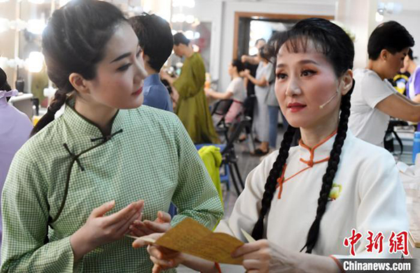 演出前,《林巧稚》主演、国家一级演员、越剧张派非遗传承人郑全(右)为青年演员说戏词。 记者刘可耕 摄