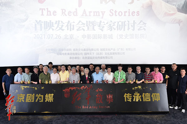 7月26日,京剧电影《红军故事》首映发布会暨专家研讨会在北京举行。该片由《半截皮带》《半条棉被》《军需处长》三个版块组合而成,展现了长征路上红军历经千难万险,坚守革命信仰的崇高精神。京剧电影《红军故事》出品方、主创、主演代表等出席活动,并与著名京剧表演艺术家刘长瑜、谭孝曾等参会嘉宾、专家学者们交流互动,评析解读影片以京剧元素为创作形式的创新独特之处和历史、现实意义及其为献礼建党100周年,建军九十四周年,传承红色革命精神的时代意义。