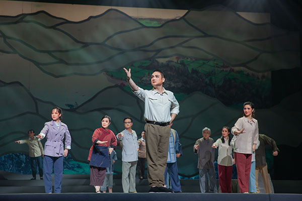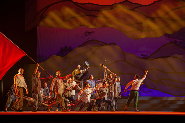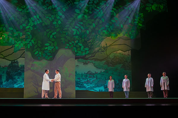 “巍巍中华,历经磨难,五千余年,史迹斑斑。英勇顽强,壮士断腕,逆行而上,破浪扬帆。向死而生,披肝沥胆,生命至上,追本溯源。”随着主题歌伴唱响起,硕大的地球仪转动,红色的“新冠肺炎”疫区触目惊心。大幕拉开,在全国率先实现以县为单位消灭血吸虫病的江西鹰潭余江区,医护人员践行伟大的抗疫精神,逆行出征,奔赴武汉……