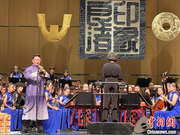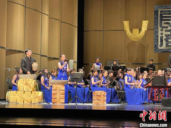 中新网杭州8月5日电(童笑雨 童威楠金鑫)清脆的鸟鸣声由远及近,渐渐地又出现了竹节敲击声、陶罐声……8月4日晚,大型民族管弦乐《印象良渚》在浙江杭州上演。