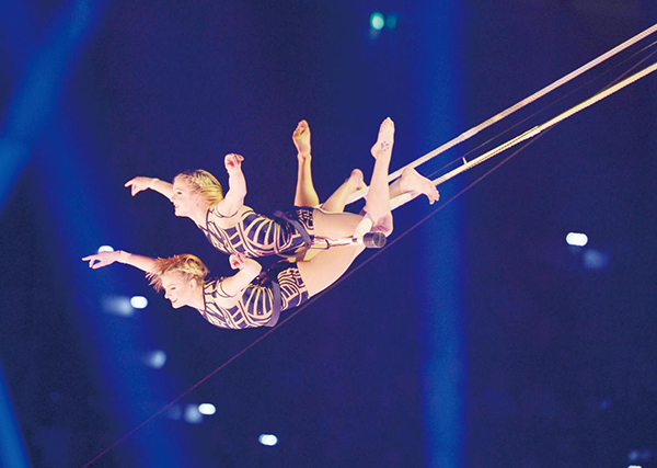 惊险的高空节目历来是吴桥杂技节的吸睛点和夺金点,也是展现杂技艺术家挑战身体极限的舞台。团体两周+后直体、吊子转体720度、手抛炫1080度、吊子分腿两周……河南金贵演艺集团的《鹰之翔——空中飞人》结合情景画面,以经典的空中飞人动作表现了雄鹰高飞的英姿,在欣赏高超技巧的同时,带给观众非凡的灵魂洗礼和唯美的视觉享受。齐齐哈尔市马戏团的《情殇——空中技巧》利用该团的高空节目优势,将原有的“空中体操”“空中秋千”部分动作与欧美风格的“男女空中吊子技巧”合理衔接,既有传统元素,又有现代风格,依托空中技巧交织的本源属性,呈现恋人离合的凄美情愫,以平衡的动态、惊险的腾跃,反映了新时代杂技人的精神风貌。宜宾市酒都艺术研究院杂技团的大型原创空中杂技《一帘幽梦》,模拟竹帘的原始形态,展现了单人、双人、三人和多人技巧造型的刚柔并济、动静交替。特别是其中的“倒立大摆”技巧,恰似春风吹拂、竹帘摇曳。扑面而来的多人组合技巧造型呈现出画卷般的壮美,形成了富含中国韵味的大型空中技巧创新作品。