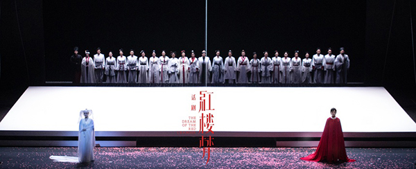 话剧《红楼梦》正是以中国古代美学精神为指归,凸显审美理想的。于是,《红楼梦》的舞台构筑极有古典特色的艺术形态与舞台化的影像呈现——整个舞台被一片洁白所包围,三面巨大的“白墙”跟随剧情走向而舒缓地打开、合上,简约的舞台之上,摒弃了荣、宁两府以及大观园外显的浮华奢靡,只存一份对空间的把持,营造出一片诗意的生活场景,从而让观众获取审美与艺术中的内省体验,直觉与理性中的情感设定,并在遵循同一性原则下,组合成一个“以简为美,以素为奢”的整体布局。随着剧情的深入,舞台上时而有漫天飞舞的“落红”飘洒,或是富有中式特征的精致木质轿子、雕花桌椅点缀,通过剧中人物不时有序的搬运,空灵中不失典雅厚重,刚健处又不失飘逸奢华,如同画卷般徐徐展开,看似漫不经心、自然铺陈,实则匠心独运、内蕴深邃,从而引申出观众无限的遐想——在似有似无的虚幻美感间,给人一种更为抽象的心象感。
