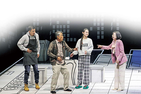 大幕拉开,和许多讲述北京故事的作品不同,《喜相逢》的舞台上没有胡同,没有四合院,而是在一个巨大的斜坡上,通过灯光和多媒体屏幕抽象展现出口密集的回天地区的万家灯火。斜坡上用现代感、科技感十足的平面和线条勾勒出不同空间,一个个生活场景跃然台上。在舞台的明灭之间串联起“他乡”与“吾乡”的种种情感交织,天通苑——这个梦想开始的地方、为梦想而奋斗的地方,瞬间走入观众心里。