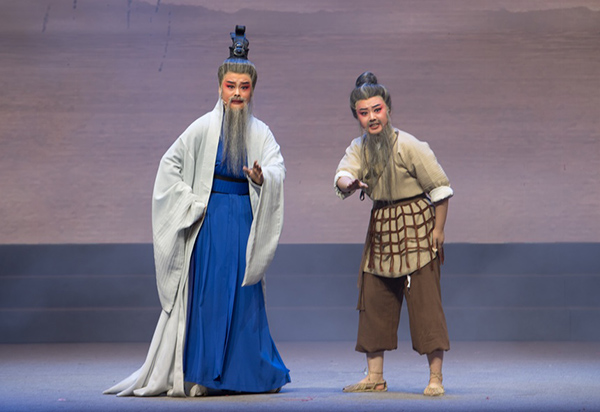 第三,是将两项非物质文化遗产融入到小戏中,凸现地域特色,增强了可看性与趣味性。越剧作为首批国家级非物质文化遗产项目,是诞生于浙江绍兴嵊州市施家岙的我国第二大剧种,又被称为“流传最广的地方剧种”,其优美动听的声音,真切动人的表演,蕴含江南的灵秀之气,为此,越剧常以表现才子佳人的故事类型为主。《子在渡口曰》却将视线投注到中国古代最重要的思想家、教育家孔子身上,创造性地将正统的儒家文化题材用越剧形式来表现,让越剧明快清新的艺术特色与儒家思想深厚的内在力量碰撞融合,在充满戏剧性的故事演绎中将孔子塑造成一个亲切、幽默、平易近人的老者,不仅将儒家思想阐释为通俗易懂的为人处世之道,还通过接地气的对白拉近相隔两千多年的时空距离。在舞台表现上,该剧充分体现了戏曲的虚拟性特色,将儒家思想的表达自然地融入进越剧的唱念做表中,使彼此相得益彰。可以说,这是一场富有探索性的创作,一方面拓宽了越剧题材的选择范围,丰富了越剧作为较年轻的江南地方剧种的艺术品格;另一方面也为儒家文化与戏曲文化互为平台、共谋传承发展提供了新的可能性。