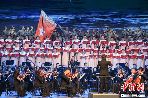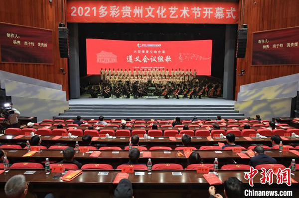 中新网贵阳12月5日电 (周燕玲 瞿宏伦)2021多彩贵州文化艺术节5日在贵阳开幕,《遵义会议组歌》以情景交响合唱的艺术形式进行首演,80分钟的节目犹如一堂生动的艺术党课,弘扬遵义会议精神,赓续红色血脉。