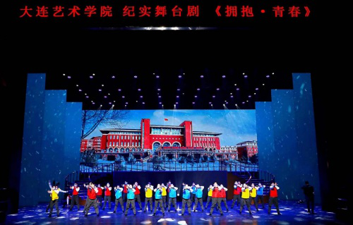 为深入贯彻落实习近平总书记在中国文联十一大、中国作协十大开幕式上的讲话精神,响应广大文艺工作者用有筋骨、有道德、有温度的作品鼓舞人们在黑暗面前不气馁、在困难面前不低头的号召,12月24日,由中共辽宁省委教育工作委员会、辽宁省教育厅、共青团辽宁省委员会主办,大连艺术学院承办的纪实舞台剧《拥抱·青春》在大连开发区大剧院上演。这是全国首部反映高校抗击新冠肺炎疫情主题的纪实舞台剧,也是大连艺术学院继“和平三部曲”“青春四部曲”之后,8年连续创排的第八部剧目。一个多月前,大连庄河疫情突如其来,对城市的考验、对在连高校的冲击是巨大的。纪实舞台剧《拥抱·青春》以纪实性手法展现大连艺术学院在疫情防控期间发生在校园的真人真事,勾勒平凡的抗疫师生群像,生动还原了大艺人的抗疫行动,以此致敬在校园抗疫中可信、可爱、可敬的大艺师生。