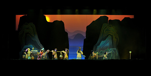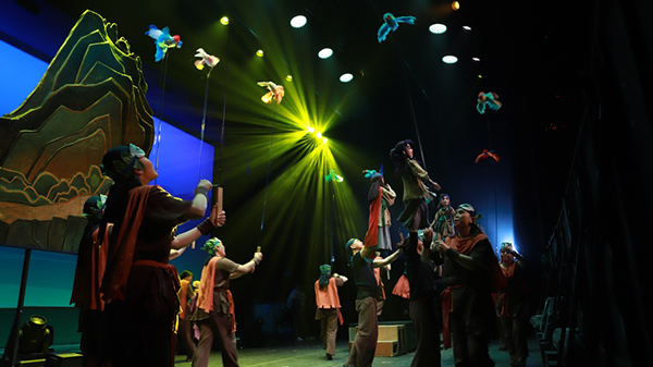 木偶剧《大禹治水》在秉承湖湘木偶戏优秀传统的同时,运用现代舞台技术与表现手法,采用工笔重彩、3D动画、浮雕等表现形式,营造不同的时间与空间层次,给观众呈现出丰富多彩的视觉盛宴,使大禹治水汹涌澎湃、波澜壮阔的场面跃入眼帘,让人仿佛身临其境。音乐制作别具一格,有上古的神韵意境,主题音乐充满力量和磅礴气势,开场便迅速吸引了现场观众注意力。木偶造型设计制作还原上古时代部落人着装打扮,形象生动可爱,演员操纵技艺精湛,木偶表演栩栩如生,活灵活现,随着大禹治水的故事慢慢铺开,台下的观众看得津津有味,不时引来大家雷鸣般的掌声。