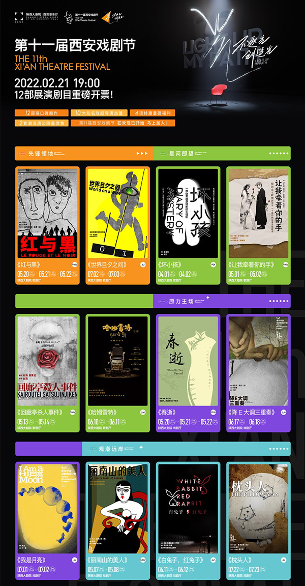 第十一届西安戏剧节全部剧目开放售票,希望让西安这座城市在未来的数月内充满戏剧的氛围,鼓励更多市民走进剧场,认识戏剧、发现戏剧,让更多的西安市民喜欢戏剧。