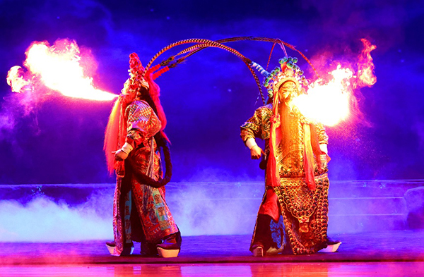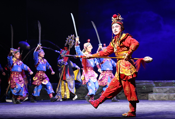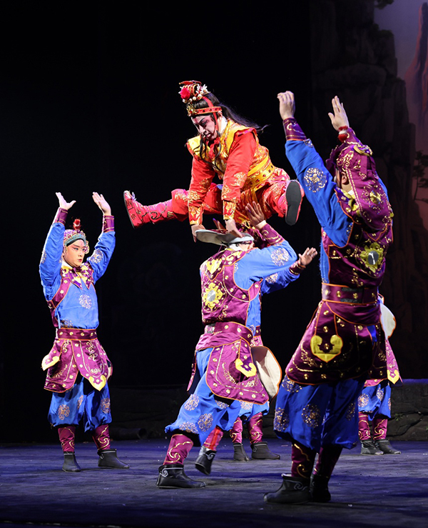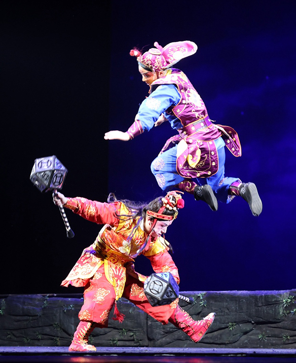 演出可谓亮点不断、精彩不绝,浙京全体武戏演员很好地发挥出各自不同的体力、耐力和舞台掌控力,整场演出中群体舞蹈整齐划一、各式武打干净利落,整体表演做到了不撒汤、不漏水,出手稳健、身段敏捷、开打迅猛、翻身快溜。特别是钱少波和黄永扮演的“沉香”与“众神将”大开打时,京剧的“三险四砸”翻打摔跌档子、技巧灵动的出手抛接,以及“沉香”和天神们贴身对打时的“前空翻变僵尸”“后空翻接甩提”“旋子360度转体”“串小翻翻过场”等一些高难度武打技巧,演员们都发挥得游刃有余。