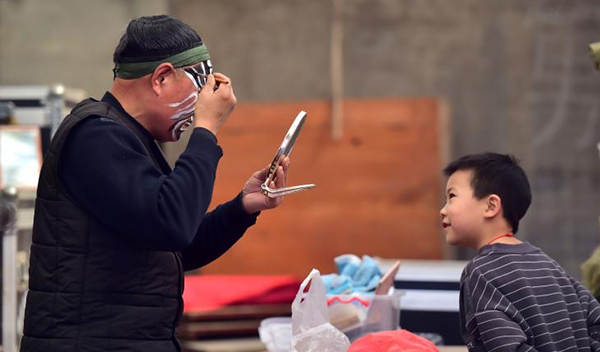 一位小朋友在观看国家级非遗“南岩乱弹”演员化装。张晓峰摄