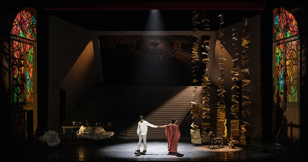 倾斜而上的光滑坡面一直延展到天幕,斜立的阶梯将其一分为二。在切割的空间里,剧中人物与舞者艰难地立于斜坡之上,芸芸众生举步维艰的人生境况一目了然。而斜坡之下,摇摇欲坠的木马和堆积如山的书卷,简明了当地指向陈白露孤独无依、压抑窒息的生存环境。穹顶造型的巨大光影则随剧情推进而不断变化,将戏剧情绪的流动外显于舞台之上。种种意象聚合营造出现代性十足、极简且优雅的舞台空间,彰显出别具一格的崭新戏剧美学。