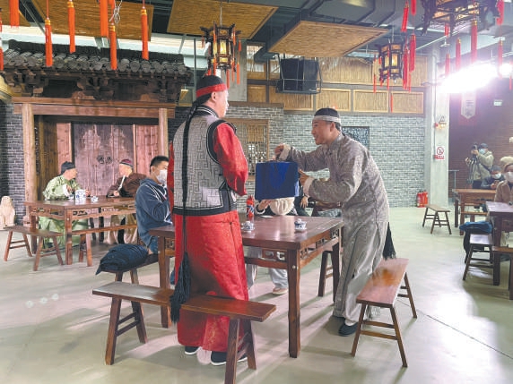 “从2019年开始我们演出了近200场,但是每一次在细节上都有不同,点菜、算命等台词大家都会即兴发挥,演员也会互换角色交流体会。”北京市曲剧团演出部主任彭岩亮介绍,“而且我们也在不断调整变化,坐在观众身边时,我们会像生活中一样和他们聊天;站起身说台词、唱曲剧时,就会拿出专业的表演范儿。”