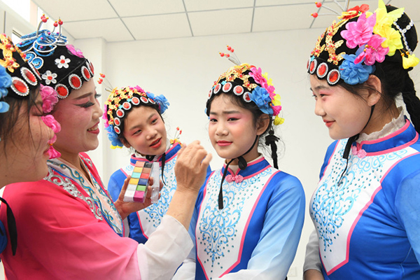 2022年3月16日,在河北省石家庄新乐市新华路小学,戏曲演员在帮小学生整理妆扮。当日,新乐市文化馆的演员们应邀走进新乐市新华路小学,指导学生们学习戏曲唱腔和表演技巧,感受传统戏曲的魅力。河北日报通讯员 贾敏杰 摄