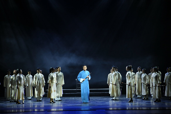 第三是他的悲悯情怀。在第四场里,赵松庭不顾家族反对,抛下善解人意的新婚妻子,在抗美援朝的召唤声中,为保家卫国毅然奔赴前线。在朝鲜战场上,面对的是冰天雪地里随时可能牺牲的生存境况,但小河南、小山东、小四川等一个个鲜活、生动的小战士们,他们的乐观心态,爱憎分明的坦荡胸怀,不仅使他们结下了纯真的革命友谊,也使他感受到了人性人情的魅力和真实动人的情感。特别是当赵松庭了解到这些小战士参加志愿军背后惨绝人寰的故事,更让赵松庭坚定信仰——不当亡国奴,与敌人拼杀到底!在这样的精神感召下,赵松庭虽没能与敌人真刀真枪厮杀在战场上,但他可以用手中的小小竹笛,为战士演奏助威、鼓舞士气,用文艺的力量同样能挺立于战争第一线。在这里,笔者觉得特别感人的一幕是,当赵松庭问战士们最大的愿望是什么时,这些腼腆、可爱的大孩子们,想的是战争胜利后能不能跟赵松庭学吹笛子,希望到时候赵松庭不会嫌弃他们学得慢……这是多么朴素的愿望,又是多么感人肺腑的言行。这一切,也点点滴滴影响着赵松庭,促他成长、助他奋进。