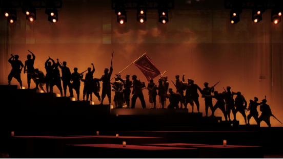 在话剧《铁流东进》的舞台上,电波作为一种无形的精神传导物质,被导演查文浩用影像、灯光、音乐、演员形体等载体立体呈现。舞台上高低不一的白色矩阵排列成摩尔斯电码符号、舞台上方纱幕的移动仿佛是发电报时滴滴答答的节奏、音乐旋律里也加入了摩尔斯电码的元素……全方位调动观众感官体验,营造出浪漫诗意的意象。