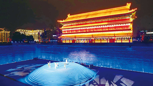 华灯初上,西安城墙南门瓮城内,旅游文化演出《大唐迎宾盛礼》给孩子们带来快乐时光。当三只小猪与黄鼠狼“切磋”的声音传来,小观众们哄堂大笑;当鲜艳的彩色兵马俑“零零九”出现,孩子们发出惊呼和疑问……随着剧情的推进,场景不断变化,孩子们目不转睛地盯着舞台,不愿意错过任何一个细节。演出结束后,小观众仍聚拢在舞台下不肯离去。对他们来说,在夏夜的星空下,在古老的城墙边,观戏剧与赏夜景奇妙融合,是梦幻般的新鲜体验。“没想到户外演出气氛这么好,儿童剧对孩子的影响是潜移默化的,希望以后还有机会带孩子看这么新颖、优秀的表演。”一位家长说。