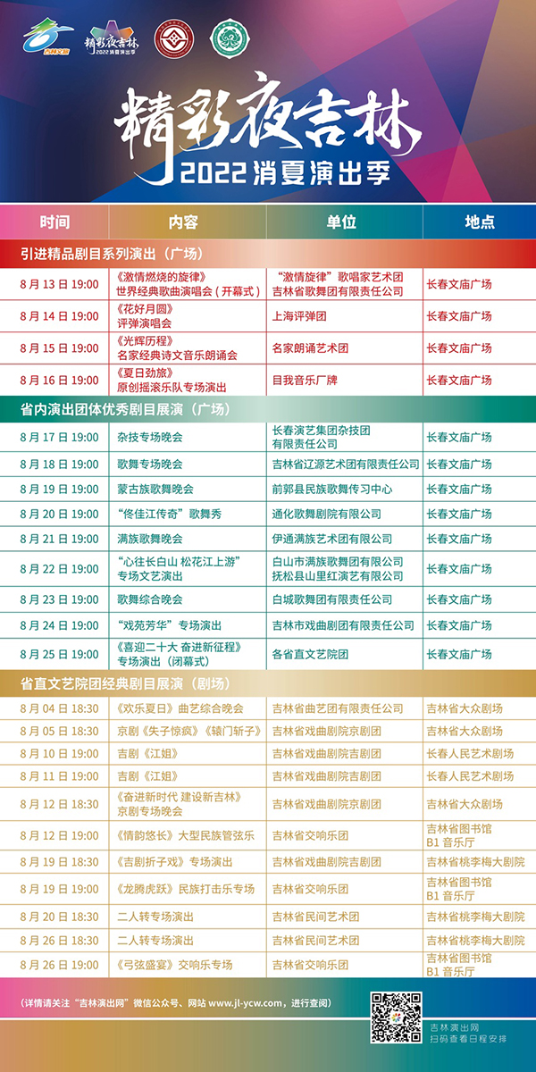 精彩夜吉林·消夏演出季自2020年举办以来,以精品、多元、惠民、可持续的特点,受到社会各界普遍好评,已经成为观众期盼和喜爱的吉林文旅品牌。此次演出季,旨在以实际行动为党的二十大胜利召开营造浓厚氛围,坚持以文塑旅,以旅彰文,以人民为中心,提供高质量精神文化食粮。本次演出季将采取广场主体活动、剧场系列演出及线上直播相结合的方式进行。广场主体活动在长春文庙广场举行,8月13日启幕,8月25日闭幕,历时13天。19家省内外演出团体将于每晚19:00,轮番亮相,带来精彩演出。