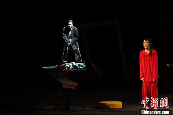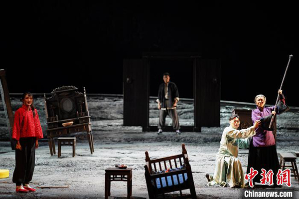 中新网北京8月17日电 (记者 高凯)“黑色基调的舞台,渲染了压抑沉重的气氛”“(鼓点)配合极尽苍凉的配乐,有叩击灵魂的震撼”,2021年首次与观众见面的北京人艺新排《原野》于16日晚再度于曹禺剧场登台,全剧呈现出的浑然一体的意象化风格又一次带领观众与这部经典作品重新相遇。