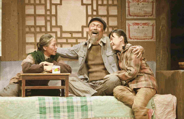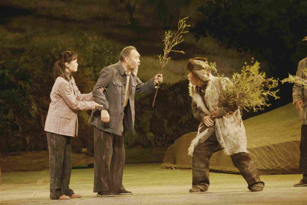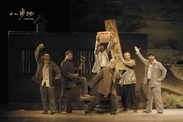 找到合适的形式,只是为剧目定制了一个“外壳”,更重要的是注入由戏剧结构和戏剧节奏组织串联起的戏剧内容。《八步沙》“六老汉”是一个群体,三代人接续奋斗近40年,在地处河西走廊东端、腾格里沙漠南缘的武威古浪八步沙建立林场,治沙造林21.7万亩,管护封沙育林草面积37.6万亩,栽植各类沙生植物3040万株,用沙生植物编成了7.5万亩的绿色缓冲带,把古浪县与腾格里沙漠相隔,在获得有形的、可计算的巨大经济效益的同时,逼退了沙漠,保住了家园,取得了无形的、难以计算的巨大生态效益。如何从漫长时间中进行截选、在众多人物中确定焦点、在海量事件中进行撷取,又如何在真假虚实中闪转腾挪,这是极为考验编剧功力的。在这一系列问题中,处于第一位的是人物,最为关键的也是人物,选取、设定好了人物,时间、事件、虚实才能得以确定、组织、调和。《八步沙》的表现对象是距离今天不远的先进人物,是客观存在的真人真事。如何处理生活真实和艺术真实是创作者首先需要解决的问题。作为艺术创作,特别是戏剧艺术,它要求人物的凝练和升华,因此戏剧人物的“真”是艺术层面的“真”,不是现实层面的“真”,《八步沙》把握住了这一点,它没有让真实人物来框定戏剧人物,而是重新捏合、塑造人物。剧中,将六个老汉分为两组治沙,这样就能有所侧重地写“陆老汉”陆沙娃、“炮筒子”王福生和“铁算盘”杨兴旺这三个性格各异、形象鲜明的人物;与之相对应,剧本写到上世纪90年代中期,治沙的前十余年,以陆老汉患病弥留之际做结,这是一个恰到好处的时间节点。因为这时“六老汉”这一群体的精神塑形已经完成,无需再赘述第二代、第三代治沙人的具体工作和成绩,这种概括和提炼正是戏剧的手法,是戏剧观察、进入、表现生活和时代的方式。