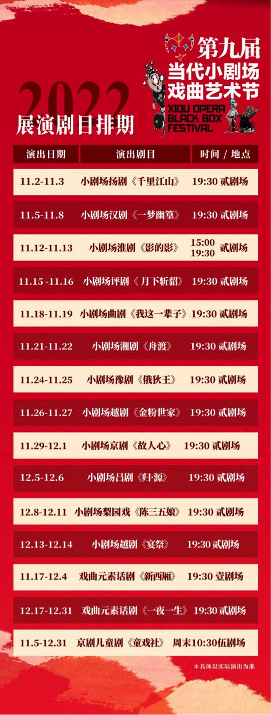 由北京市西城区文化和旅游局、北京戏剧家协会、北京天艺同歌国际文化艺术有限公司共同主办,繁星戏剧村承办的第九届当代小剧场戏曲艺术节将于11月2日至12月31日在北京繁星戏剧村举办。