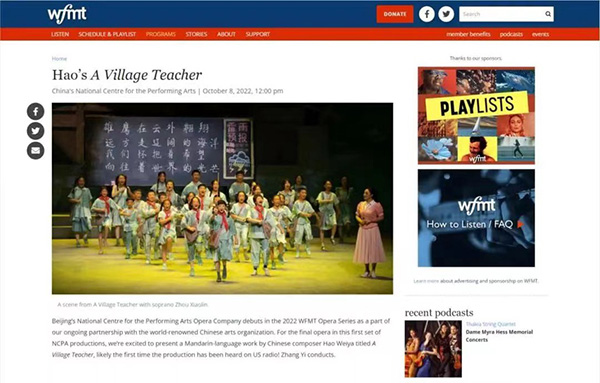 当地时间10月8日中午,国家大剧院原创歌剧《夏日彩虹》在美国芝加哥古典音乐电台(WFMT)著名广播节目“歌剧系列”中全剧播出,随后还将陆续在纽约古典音乐电台(WQXR)、华盛顿古典音乐电台(WETA)、伊利诺伊州公共媒体电台(Illinois Public Media)、新墨西哥州古典音乐电台(KHFM)等65家美国电台,通过268个转播站面向纽约、华盛顿、费城、亚特兰大等333个美国城市播出。这也是中国现实题材歌剧首次大范围在海外主流媒体播出。