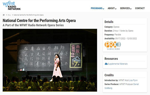据悉,“歌剧系列(Opera Series)”是芝加哥古典音乐广播网制作了20余年的周播节目,也是美国最有影响力的歌剧节目。每期节目播放一部全球顶尖剧院的优秀歌剧作品,与大都会歌剧院的广播节目共同承揽美国多家电台全年的歌剧广播内容,深受听众喜爱。“歌剧系列”节目不仅在芝加哥古典音乐电台播出,还通过美国公共电台交换平台(PRX)供全美公共电台选播。由于内容优秀、制作精良,“歌剧系列”每年都被几十家电台争相播放,播出范围几乎覆盖美国全境。