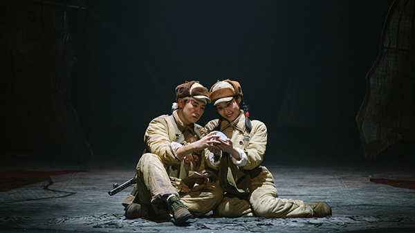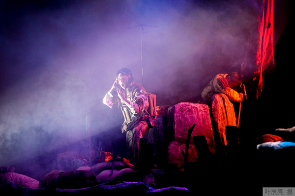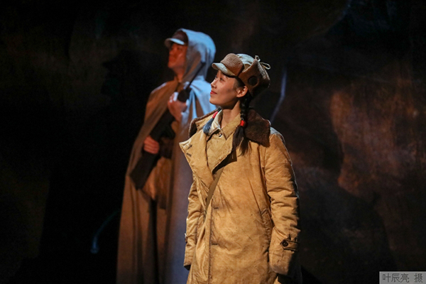 譬如第七场,舞台左上角一束红色的追光投射到王成身上,震撼人心地再现了王成“双手紧握爆破筒/怒目喷火热血涌/敌人腐烂变泥土勇士辉煌化金星”壮烈的画面。舞台左下角是简易的前线指挥部,师政委王文清和团长在大声紧急地呼叫王成。舞台艺术,一旦在剧场与观众见面,演员就是所有审美聚焦的焦点。在话剧《英雄儿女》中,志愿军英雄的激情燃烧着演员,同时通过演员激情燃烧的表演点燃了我们内心的激情。我特别喜欢饰演王芳、王成的年轻演员贺梦洁和刘炫锐。他们将共和国青春年代年轻人所特有朝气、理想、清纯、可爱的形象,演绎得那么真诚、自然。隔着70年的历史长河,我看到了当下的青春和历史的青春的热烈拥抱,看到了不同时代年轻人灵魂的真诚对话。“他们的眼睛里有光,并且是那么的清彻”。包括在舞台上穿梭的每个群众演员都在进入角色,每个战士都眼里有光。有光,就有感染的力量。“为了胜利,向我开炮!”王成竭尽生命全力嘶哑的叫喊,王芳在哥哥牺牲后回忆兄妹一起的点点滴滴,坐在舞台前端长时间的埋头抽泣,令人为之动容。这是一群令人可敬可信的“最可爱的人”。以上就是我看话剧《英雄儿女》的充足理由。