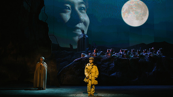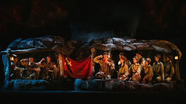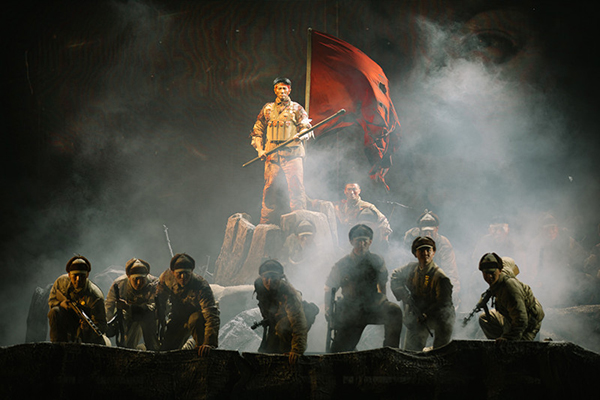 话剧《英雄儿女》的“初战告捷”在于,小说和电影原作提供了扎实的生活体验和艺术基础,但告捷的更重要原因在于,全剧的舞台呈现有气质有激情有人情。作品努力站在新的时代高度,对小说和电影精神内涵再度深入开掘。在巴老的小说中,王成、王芳的英雄主义为浓郁厚重的兄妹、父辈和两代人情感所包裹,同名电影选择突出了英雄气概带动人间温情,话剧则将这两个部分糅合在一起,进一步丰富了人物的精神世界和理想情操。“为什么战旗美如画?英雄的鲜血染红了它。”话剧以自己独特的方式,歌颂了志愿军战士为了保家卫国,不惜牺牲的大无畏的英雄主义气概。精心保留并且强化了了电影中王成一人孤守无名高地,在敌人四面包围的绝境中,高呼“向我开炮”,端着爆破筒冲向敌人,与敌同归于尽的高扬着英雄主义精神的经典瞬间;而且加入了大战前夕,在弥漫的硝烟和隆隆的炮声中,王成小四川在狭隘的坑道里宣誓,火线入党的庄严场景,一面简易的红旗映红了他们青春的脸庞;王成和王芳、小四川和文工团队长凌光华、战士们和文工团员们,一字一句签订、朗读生死协议视死如归的庄严时刻。话剧以一曲酣畅淋漓的英雄主义的讴歌,唤起了观众内心的英雄主义激情。英雄主义是人类战胜一切困难的精神力量。英雄主题,是人类最早的神话、史诗的不朽主角,也是古今中外文学艺术生生不息的母题,更是中华民族历经苦难,“越过高山,越过平原,跨过奔腾的黄河长江”,生生不息的精神伟力。
