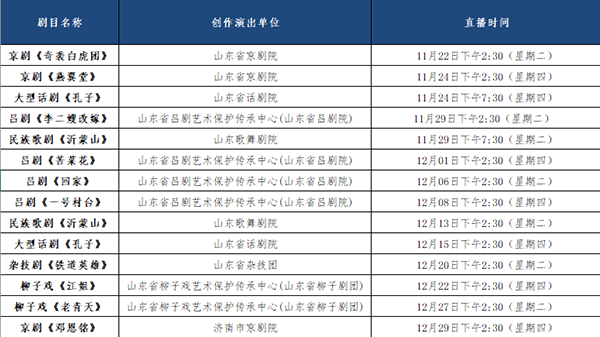 2022年是党的二十大召开之年,为深入宣传贯彻党的二十大精神,以鲜活生动的艺术形象传承弘扬革命精神、讴歌火热现实生活,山东演艺集团“齐鲁云剧场”数字演艺服务平台联合中国文化传媒集团“文旅中国”客户端、“云演播”客户端,于2022年11月至12月以网络剧目视频展播方式,组织开展“喜庆二十大·山东优秀剧目网络展演”活动。