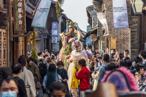 在乌镇,戏剧随时随地发生。本届乌镇戏剧节上千场古镇嘉年华演出填满了剧场之外的每个角落,包括传统文化、即兴喜剧、戏曲、戏剧、装置艺术、舞蹈、偶剧、杂耍魔术、肢体剧等,更有非遗表演木偶戏、南音、皮影戏、独竹漂等在乌镇“丰”盛。其中,木木之家鼓声四溢,舞蹈动人,所到之处皆有喝彩;北纬42°艺术工坊以中国二十四节气为灵感,精心雕琢寓意节气“大雪”的服饰;木鸟象艺术剧团以蒸汽朋克主题的艺术视觉秀与即兴会演吸引了各年龄段观众的喜爱……席地搭台,承天为幕,风雨无阻,移步换景,一场场表演给观众带来艺术视听盛宴,开启街头的奇幻之旅。