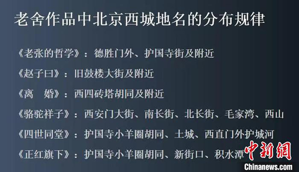 中国老舍研究会副秘书长史宁在论坛中提到,“老舍先生的文学作品当中,人物活动的场景基本是真实的北京地名,这是一个非常突出的特点。梳理之后会发现,真实地名最多的集中在西城。”