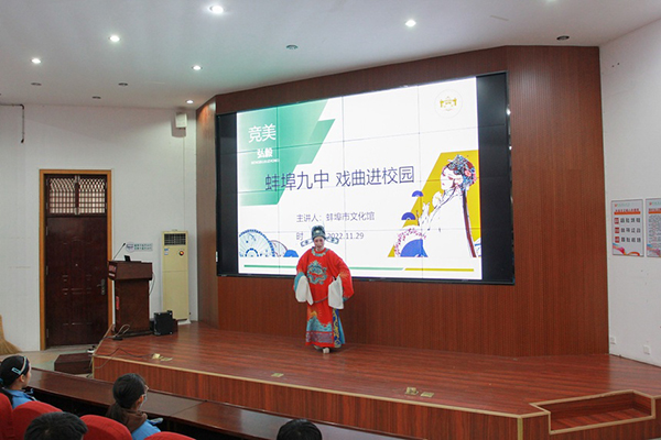 11月29日下午“戏曲进校园”活动在该市第九中学举办。演员们以娴熟的表演技巧、丰富的造型,刻画了栩栩如生的戏剧人物形象,将传统戏曲蕴含的艺术价值和教育价值展示、传递给广大师生,为师生们献上了一场丰盛的文化大餐。具有地方特色的泗州戏《拾棉花》将演出拉开帷幕,随后《智取威虎山》选段《打虎上山》、《贵妃醉酒》、《铡美案》选段《包龙图打坐在开封府》等经典京剧选段赢得现场的掌声阵阵,最后川剧《变脸》的精彩绝技表演获得全场喝彩。