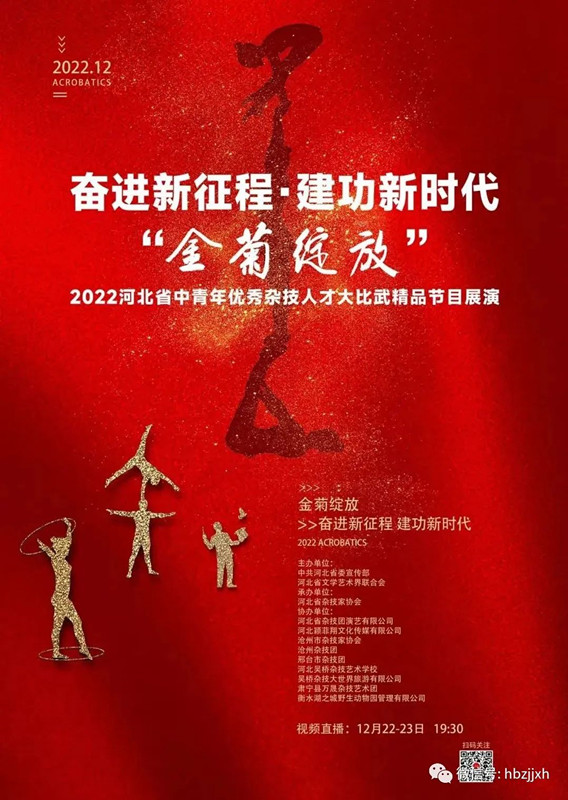 为深入学习宣传贯彻党的二十大精神,由中共河北省委宣传部、河北省文联主办,河北省杂技家协会承办的奋进新征程·建功新时代 “金菊绽放”—2022河北省中青年优秀杂技人才大比武精品节目展演分别于2022年12月22日至23日19:30在中国杂技官方微信公众号、中国杂技视频号、抖音号、快手号、长城新媒体、河北新闻网、河北省文联《紫藤树下》直播专栏、河北省杂技家协会官方微信公众号等平台同步进行直播,线上主题直播活动人气爆棚,各渠道网友观看量达835万人次。