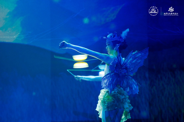五彩斑斓的房子里,小萝卜头跟随母亲一起自由地舞蹈,站在父亲眼前与他比身高,牵着父母的手,于飘逸“绸吊”中翱翔于蓝天白云;萤火虫漫天飞舞的森林里,“空竹”女孩们化作一个个美丽的精灵,与小萝卜头手拉手愉快地玩耍,互相配合着击退怪兽;富丽堂皇的餐厅里,小萝卜头雀跃地跟着“炊事员”摆放各式各样的精美食物;他蹦蹦跳跳着,看到一个绿意盎然的新中国,矗立于他的眼前……