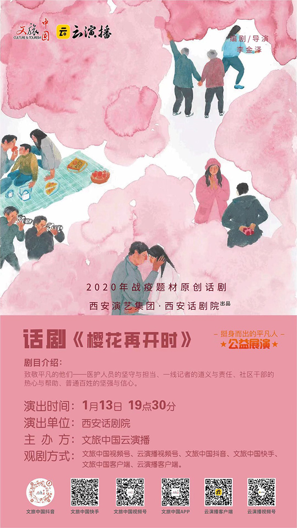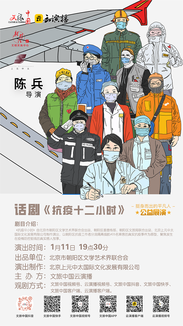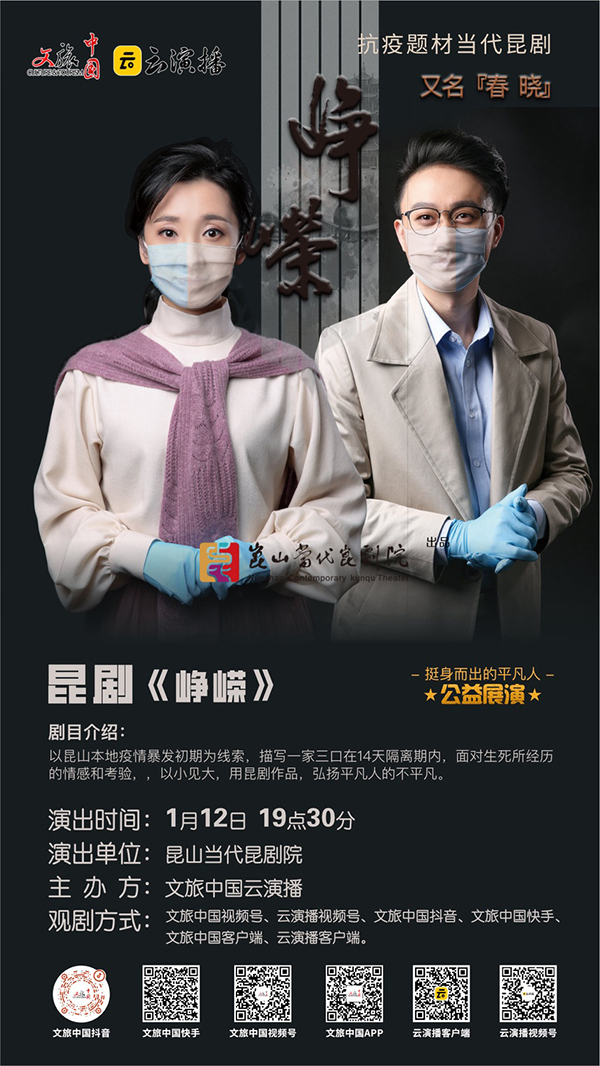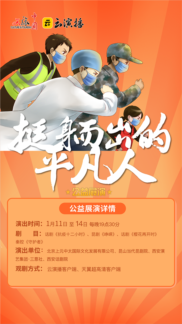 为传播舞台艺术、探索舞台艺术数字化运营创新发展领域、文化惠民以及为致敬所有抗击疫情的前行者,文旅中国云演播平台联合朝阳文联&北京艺仲仁教育科技公司、昆山当代昆剧院、西安话剧院和西安演艺集团·三意社,于1月11日至1月14日面向全国用户举行策划“挺身而出的平凡人”剧目云上公益展演主题活动。