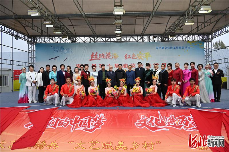 4月7、8日两天,安平县杨屯村演出现场热闹非凡,万亩油菜花竞相绽放,与惠民演出交相辉映,构成了一幅绝美的春日画卷。开场舞《鼓舞神州》一亮相,便以激昂的旋律、矫健的舞姿瞬间点燃了全场气氛,为整场演出拉开序幕。紧接着是为此次巡演创作的歌曲《唱唱安平范儿》,叫好声和掌声此起彼伏,引起现场共鸣,掀起了高潮,赢得满堂彩!值得一提的是,安平县文化馆的文艺工作者们也登台助阵,以精彩的表演和富有地方特色的唱词,引得观众共鸣连连,掌声不断。最后,歌伴舞《走在希望的新时代》展现出对新时代的赞美和对未来的美好憧憬,为整场演出画上了圆满的句号。