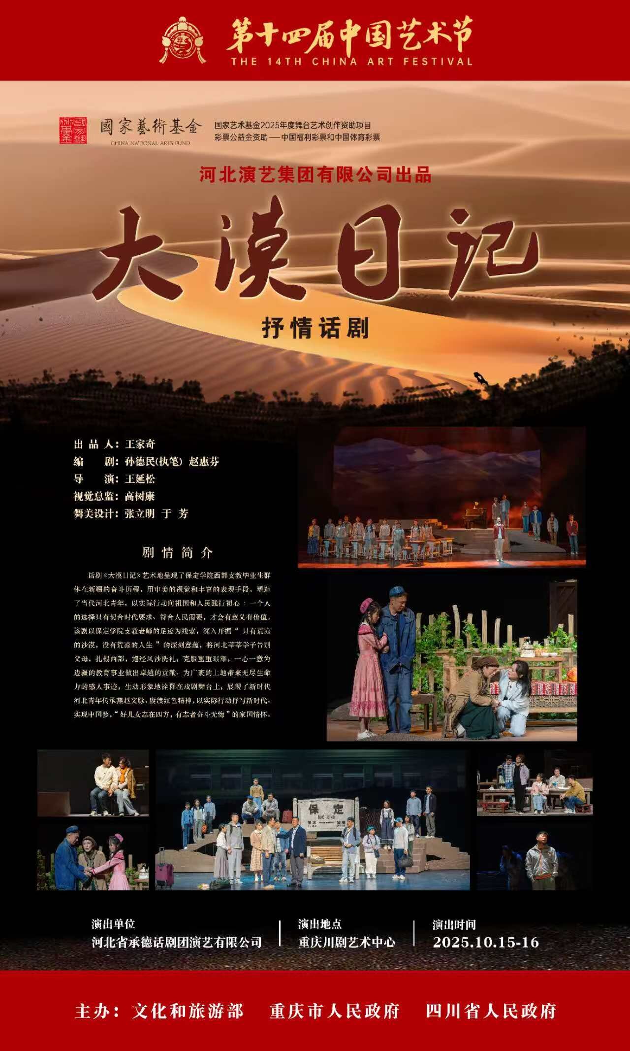 由河北省承德话剧团创作的聚焦河北保定学院西部支教毕业生群体、承载青春奉献与文化传承使命的抒情话剧《大漠日记》,艺单位系列惠民演出项目城市剧场惠民演出活动,于10月在重庆川剧艺术中心参加第十四届中国艺术节的展演。
