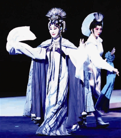 来自中国台湾的国光剧团,15日晚在上海大剧院演出《水袖与胭脂》,这部被冠以“京剧·昆剧”名头的舞台剧以京剧为主,“戏中戏”则多为昆曲,此外还夹杂了一些近似歌曲的唱段。整出戏以死后的杨贵妃、唐明皇为主角,以往戏曲舞台上常见的李杨爱情戏或浓情蜜意、或凄美婉转,而《水袖与胭脂》因穿插了大量戏中戏,又以较大篇幅来展现戏曲的武功身段乃至演员反串的才艺,使整体风格显得十分热闹。