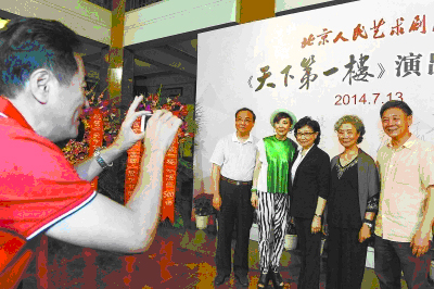 在《天下第一楼》演出500场纪念活动现场,杨立新为编剧何冀平,演员吕中、岳秀清、李光复等人拍照。