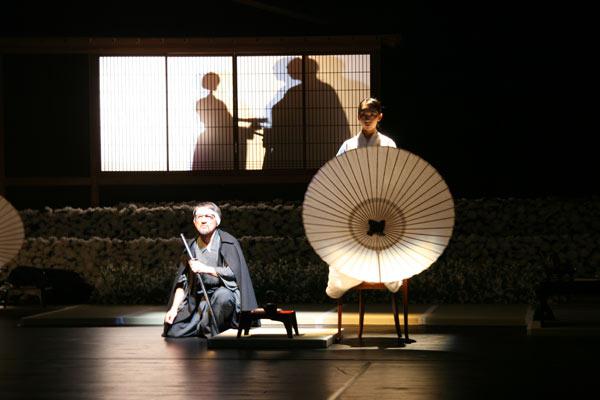 此外,这出戏还有一点特别之处——演员是光脚演戏的。在樱花和日式建筑间,演员如磐石一般站立,走路时脚跟也像吸铁石一样紧紧抓地,这样别具一格的形体塑造正是源自铃木独创的“铃木表演法”。
