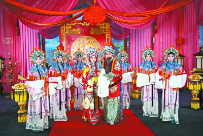 作为《龙凤呈祥》全剧的重头戏,“洞房”是最后拍摄完成的。图为停机后,主演李维康、耿其昌与群众演员合影留念。