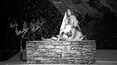 听——融合着川剧的高腔与藏族的民歌,唱尽了古朴辽远与婉转低回。听剧中的中心人物傻子,他的唱以高腔为基调,融进了藏族民间音乐“锅庄”,人物个性被恰到好处地表现了出来,半是痴狂,半是忧伤。听剧中饱受奴隶制度压迫的藏族姑娘卓玛,她的唱腔中既有川剧的固有元素,又不等同于一般的闺门旦,高原雪域的旋律转化为如泣如诉的“哭板”,百转愁肠、惹人怜惜。再听剧中那绕梁三日的领唱和帮腔,观众不由自主地被带进藏族圣地,不知不觉地循着声音感受到雪域之阔、心灵之净。