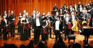 俄罗斯指挥大师捷杰耶夫(前左)携手我国钢琴家孙颖迪(前右)为胜利日激情献演。