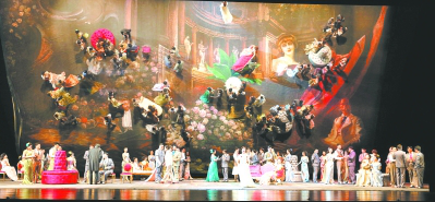 国家大剧院版《茶花女》标志性的巨幅镜面曾被誉为“充满诗意”,独特的设计每一次亮相都能引得观众的啧啧称奇。大幕拉开后,舞台漆黑背景中央浮现的一朵纯白的茶花慢慢染成了鲜红色,伴随着熟悉的“茶花女”序曲响起,264平方米的镜面缓缓升起,直至面向观众席倾斜45度角,将地面上油彩质感的画布折射出来成为了背景。随着灯光转亮、身着华服的演员们手持酒杯登场,纸醉金迷的巴黎社交圈聚会立刻呈现在观众眼前。当第二幕转为巴黎郊外的田园,镜幕反射出地面画布上鲜花盛开的田野,配上几件简洁的道具,乡村生活的恬静立刻跃然台上,而最后一幕,薇奥莱塔的病榻前散落着家具、皮箱,凄凉之情更是溢于言表。在薇奥莱塔唱出临终的咏叹时,镜幕再次变化角度,将指挥、乐团和全场观众纳入镜中,共同见证着一个美丽生命的最后时刻,令人动容。